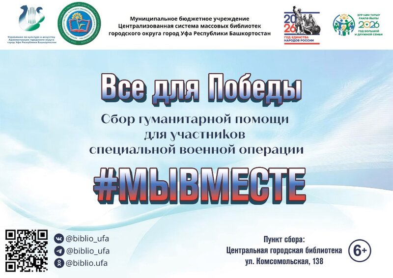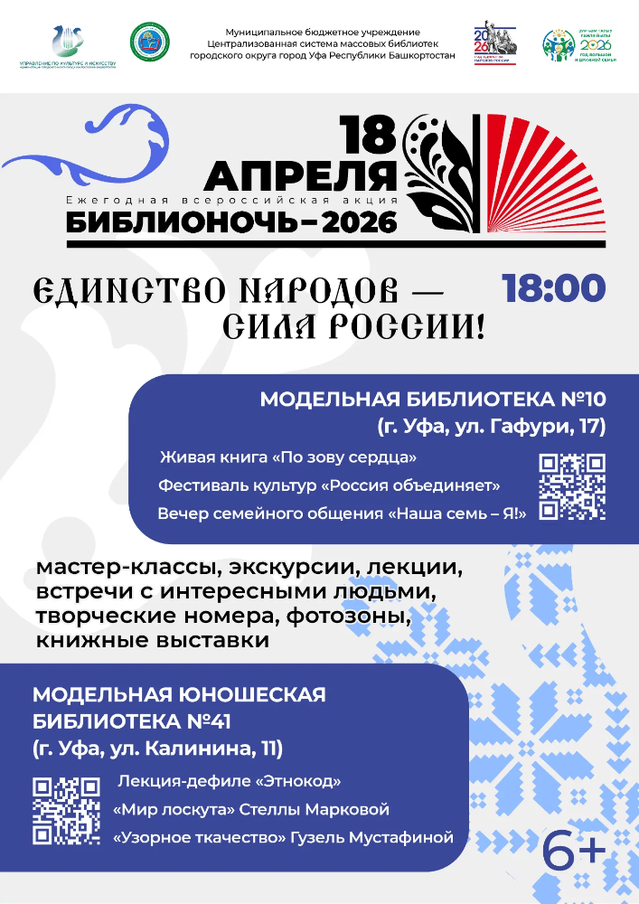 Приглашаем жителей и гостей Уфы присоединиться к Всероссийской акции «Библионочь‑2026», которая пройдёт под девизом «Единство народов — сила России!». Это событие посвящено Году единства народов России и Году большой и дружной семьи в Республике Башкортостан. Вас ждёт вечер, наполненный духом культурного многообразия, семейными традициями и теплом живого общения.
